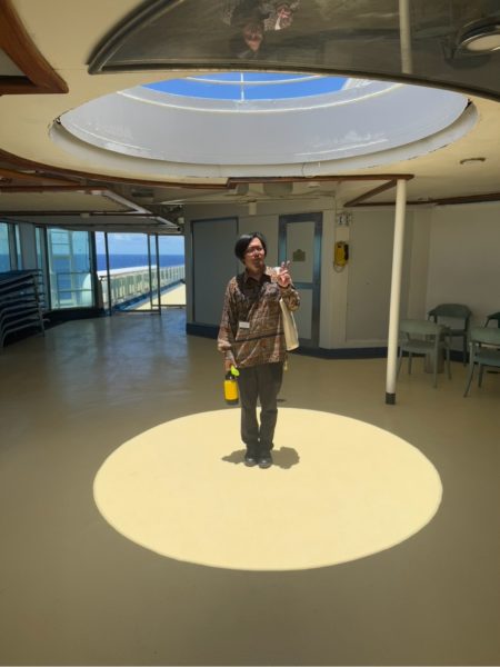 船の向きによって日々太陽や月の位置が変わるのも楽しんでいました。毎日船は進んで、海の色も変わっていきます。そんな、船旅らしい景色を楽しめる場所です。