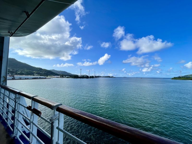 特におすすめなのは、寄港地への入港シーン。上層階のデッキも良いですが、ここは人が少なく、じーっと景色を独り占めできる穴場スポットだと思っています。