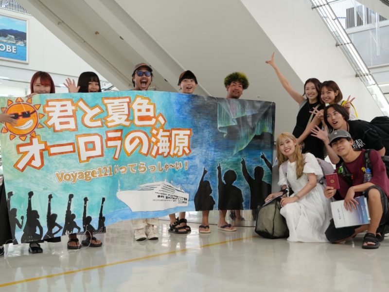 <8月に出航したVoyage121の出航を見送ったとき。みんなで夏クルーズならではのオーロラを題材に「いってらっしゃい」の横断幕を作りました>